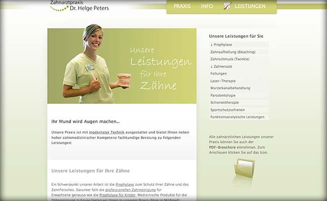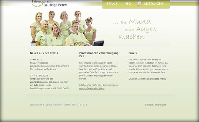 Konzept und Umsetzung der Website für die Zahnarztpraxis Dr. Peters aus Mildstedt auf Basis von TYPO3.